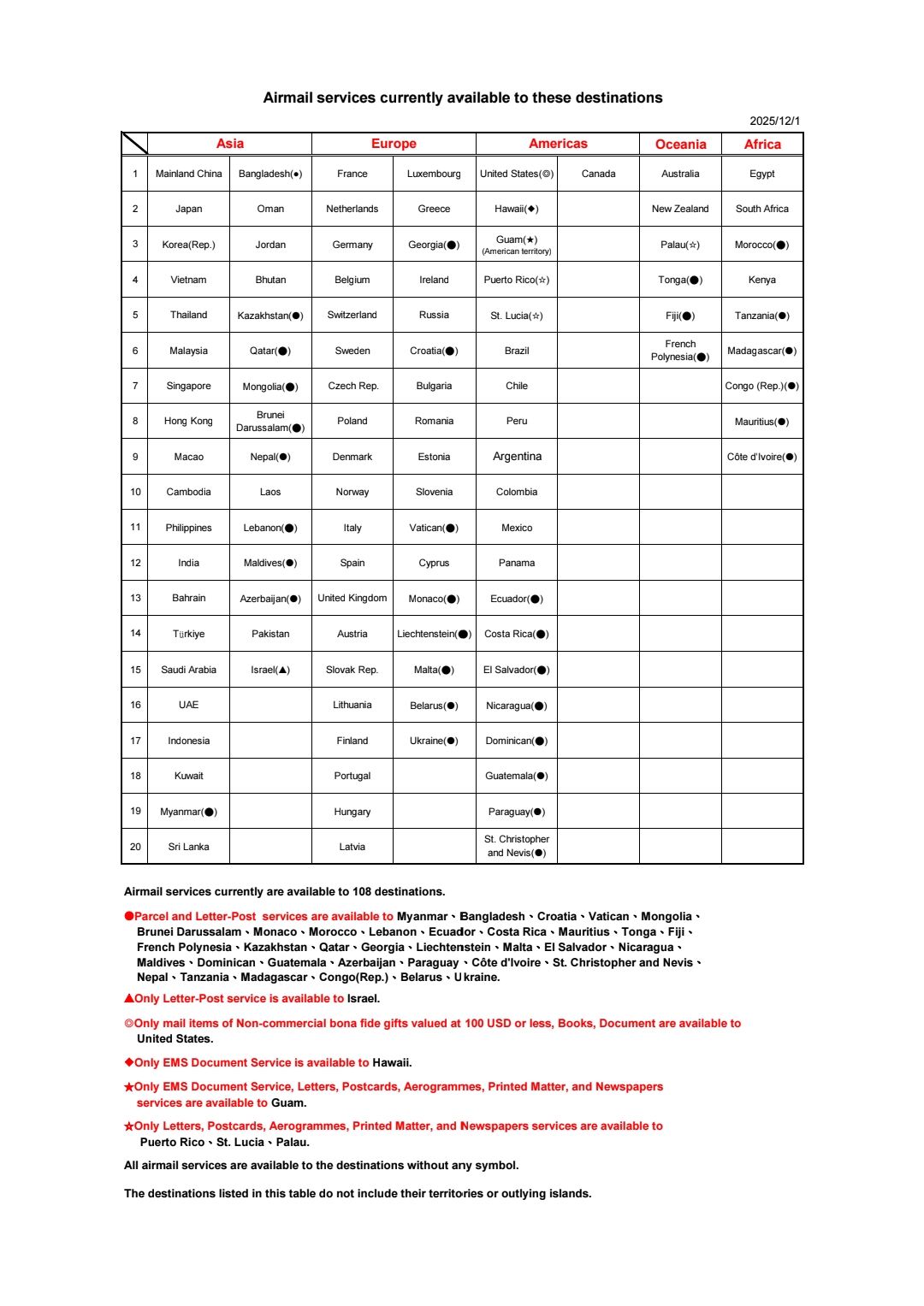 Please be noted that postal service is available to 108 destinations (countries) at the moment. Shown as the chart below provided by Chunghwa (Taiwan) Post, and updated on December, 1st, 2025.